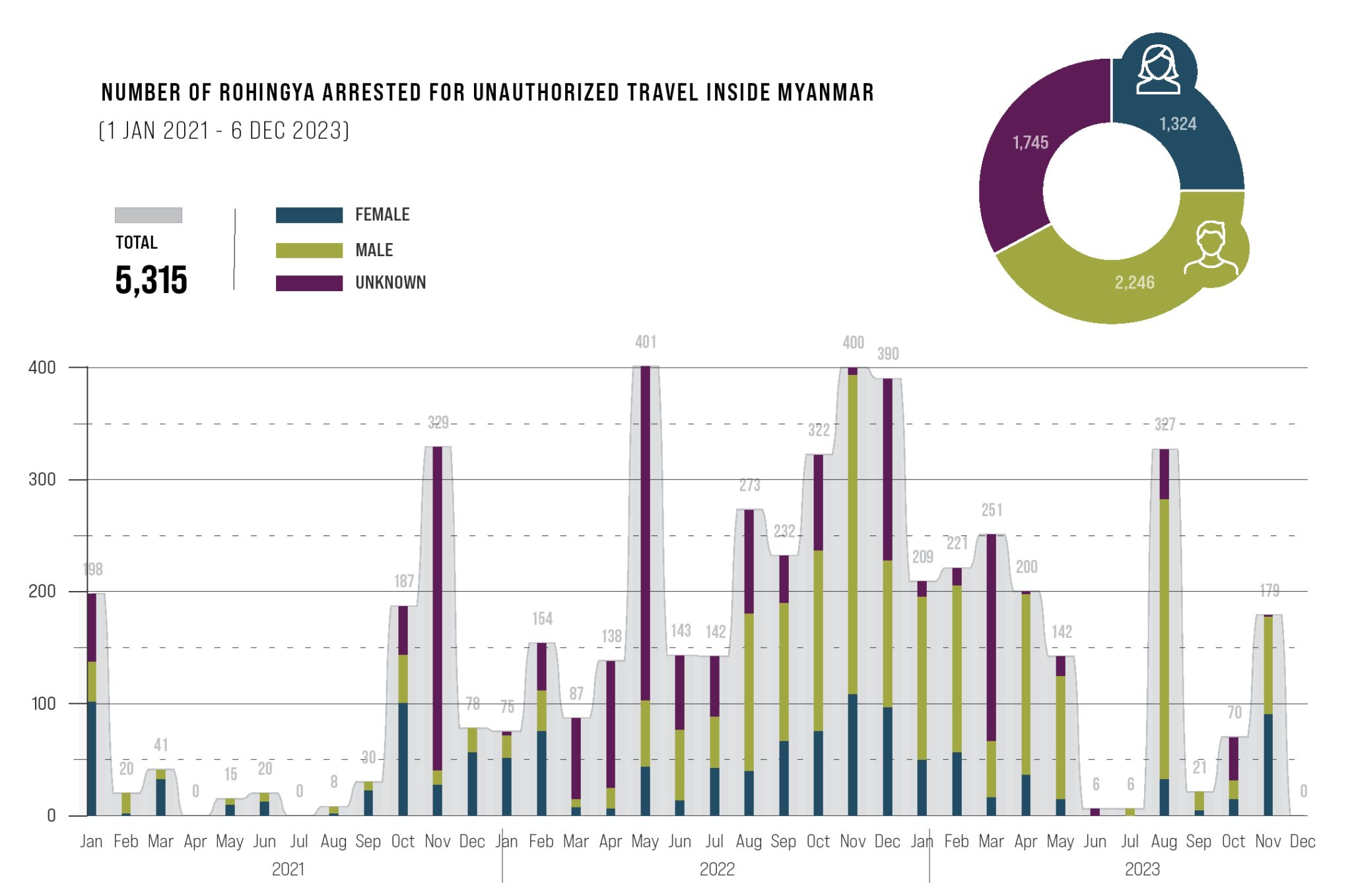Number of Rohingya Arrested for Unauthorized Travel inside Myanmar (1 Jan 2021 – 5 Dec 2023)