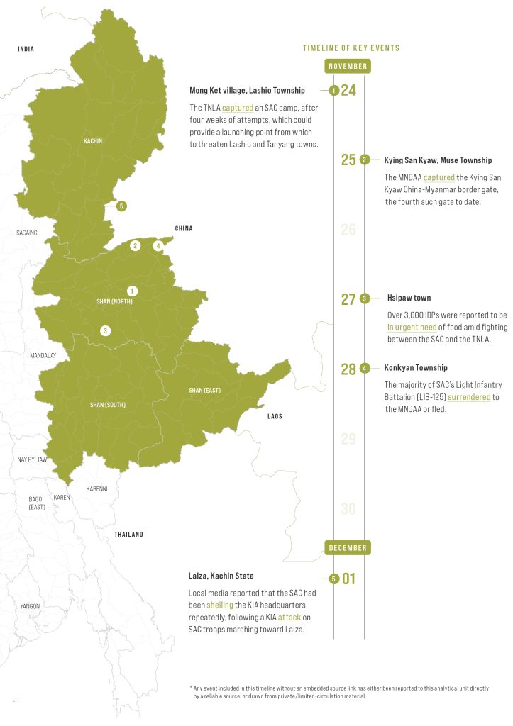 In Northern Shan State, fighting connected to Operation 1027 has continued to affect civilians, with tens of thousands displaced. The SAC has still not been able to recapture — or remove EAOs or PDFs from — key towns and transport routes, and at least five bridges have been damaged. Meanwhile, 3BA members claimed to have captured five Myanmar-China border towns, in one of which the MNDAA claimed to have established administrative mechanisms, and which host four border trade gates. As they continued to capture towns and other territory, reports emerged suggesting that the MNDAA has engaged in wide-scale recruitment, at least some of it by force. Imminent fighting in Laukkaing city could displace many thousands of people, and it could represent a humanitarian disaster in which response actors have little capacity to address needs; tens of thousands streamed out of the city after the MNDAA lifted a roadblock on 26 November, but many of those displaced have nowhere to go. Meanwhile, two Shan armed actors agreed to a peace deal, though the precise nature of the agreement and the motives behind it remain unclear.