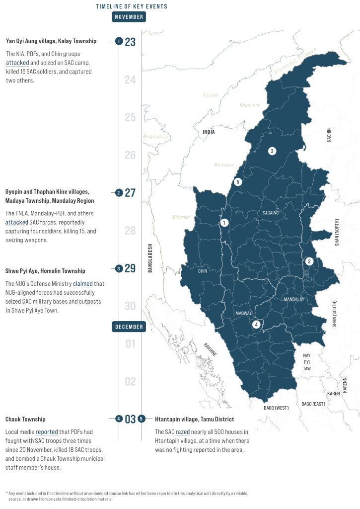 Fighting in the northwest continues at a high level, as it had even before Operation 1027 cascaded into a nationwide escalation in armed violence. Resistance actors continued to capture towns in Chin State, and other groups attacked SAC positions around towns in Sagaing Region. Meanwhile, the SAC continued to torch houses, kill and abuse civilians, and launch airstrikes and artillery in response to resistance attacks.