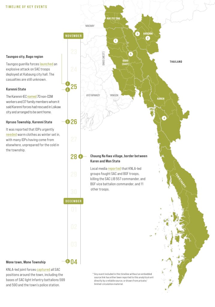 Karenni resistance forces continued their attacks in the state capital of Loikaw in Operation 1111, apparently capitalising on the momentum of Operation 1027 and nationwide escalation, but humanitarian needs continued to rise. In Karen State and Eastern Bago Region, KNLA-led fighters attacked SAC positions around towns — including in Kawkareik town and all SAC positions in Mone town — in an apparent shift from previous tactics.