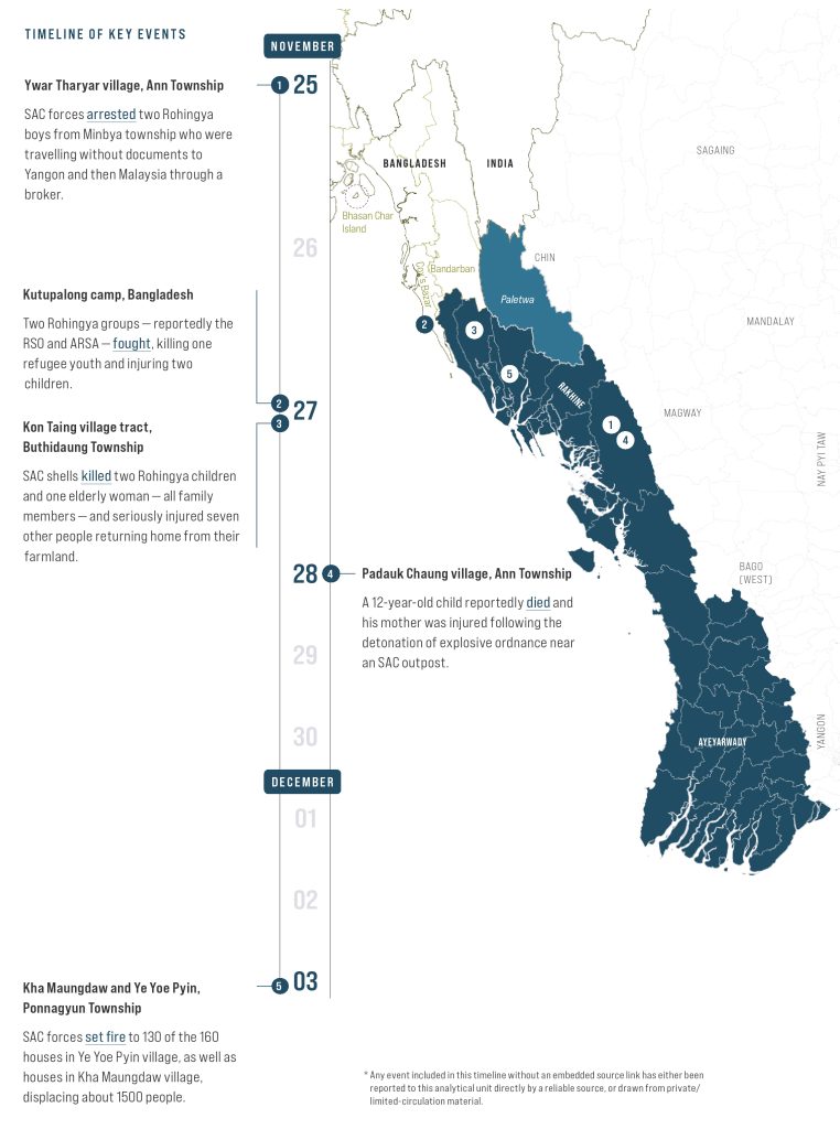 Meanwhile, sources have told this analytical unit that Rohingya communities are under increasing pressure from both the SAC and the AA, and that Rohingya armed actors have also engaged in more frequent abuses against Rohingya communities. These pressures have likely contributed to the continued attempts of Rohingya people to leave the state under unsafe conditions that often result in detention or worse.
